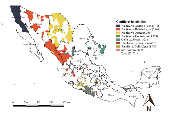 Según un informe de la Secretaría de Gobernación, de 2010, de los casi 29 mil homicidios vinculados con el crimen organizado y registrados entre el 1 de diciembre de 2006 y el 31 de julio de 2010, un 80% habían ocurrido en 162 de los 2.456 municipios del país, y habían sido resultado de los enfrentamientos de por lo menos siete cárteles de drogas (segob, 2010). Entre aquellos a los que se atribuyeron los enfrentamientos armados y homicidios en este periodo se encuentran el cártel del Pacífico (o Sinaloa), dirigido en ese entonces por Joaquín Guzmán Loera; el cártel de Tijuana (o de los Arellano Félix), enemigo del cártel de Sinaloa desde los años noventa; el cártel de los Beltrán Leyva, que en un principio estaba ligado estrechamente al cártel de Sinaloa; el cártel de Juárez, dirigido hasta 1997 por Amado Carrillo; el cártel del Golfo y su brazo armado, Los Zetas, que tras una ruptura con el cártel del Golfo formaron su propia organización criminal; y finalmente la Familia Michoacana, con presencia en la región de Tierra Caliente (segob, 2010).