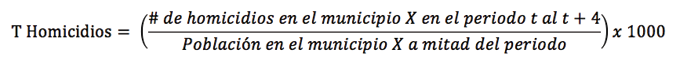 Respecto al análisis de los municipios más violentos del país, se seleccionan a partir de sus tasas de homicidios quinquenales, las cuales se calculan con la fórmula indicada a continuación, para posteriormente seleccionar el 20% de los municipios con las mayores tasas de homicidios para cada periodo.