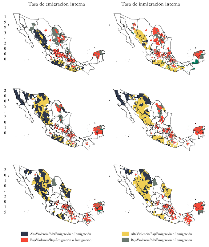 La violencia y la migración interna en México desde inicios del siglo xxi muestran una asociación significativa, particularmente en algunas regiones del norte y occidente del país donde se da una importante presencia de grupos del narcotráfico. Tal asociación es también resultado de la estrategia de seguridad federal denominada “Guerra contra el Narcotráfico” iniciada a finales de 2006 por el expresidente Felipe Calderón, consistente en el enfrentamiento directo de las fuerzas armadas contra los grupos criminales, y en especial contra algunos de los principales cárteles de drogas en México, que provocó el abatimiento de algunos de sus líderes y la división entre los cárteles por el control de los territorios y de las rutas de cultivo, producción, distribución, venta y trasiego de diversos tipos de drogas. A partir del periodo 2005-2010, se observa una asociación espacial significativa entre municipios y regiones con altos niveles de violencia cercanos a regiones con altas tasas de emigración interna y bajas tasas de inmigración interna, lo que puede dar evidencia sobre los efectos de la violencia en la dinámica migratoria interna en México resultante de los desplazamientos internos forzados por violencia e inseguridad en años recientes.