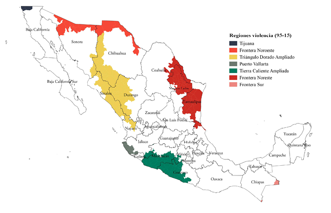 El análisis de la correlación espacial entre las regiones del país con altos niveles de violencia, altas tasas de emigración y bajas tasas de inmigración interna municipal arrojó tres regiones de estudio: Triángulo Dorado ampliado, localizada al noroeste de México; Tierra Caliente ampliada, situada en el occidente de México; y Frontera Noreste, ubicada en Nuevo León y Tamaulipas. Las dos primeras se caracterizan por la presencia e historia en la formación de los principales cárteles de drogas mexicanos y de algunos de sus líderes, así como en el cultivo de marihuana y amapola desde los años cuarenta, lo que, junto con sus condiciones geográficas, climáticas y sociales, ha representado para los cárteles mexicanos las regiones de mayor producción de drogas en el país. Las tres regiones analizadas forman parte de las principales rutas terrestres de trasiego de drogas hacia eua, las cuales vieron incrementar su importancia internacional tras la alianza entre los cárteles mexicanos y los colombianos en los años noventa como respuesta al declive de la ruta del Caribe que, hasta ese momento, los colombianos usaban para introducir cocaína en el mercado estadounidense.