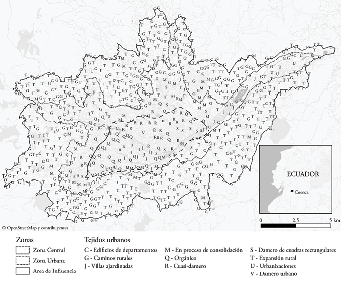 Para el presente estudio, la ciudad ha sido dividida en tres grandes zonas (Figura 2): la zona central, que incluye el área de la ciudad delimitada por la Av. de las Américas y la Circunvalación Sur; la zona urbana, que abarca el área alrededor de la zona central hasta la demarcación oficial del perímetro urbano de la ciudad; y, finalmente, el área de influencia inmediata definida en el Plan de Ordenamiento Territorial del cantón Cuenca.