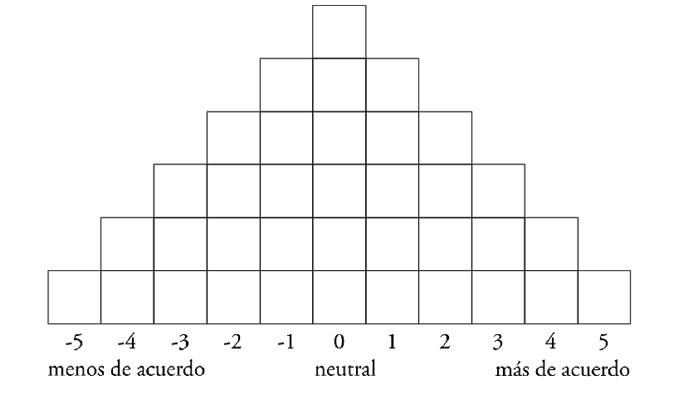 En el método Q, un grupo de participantes (conjunto P) recibe un juego de tarjetas con declaraciones que representan un amplio rango de puntos de vista (conjunto Q) sobre la temática de estudio y las ordena en una estructura piramidal (ordenación Q), según su grado de acuerdo individual (Figura 1). Durante el ejercicio, el investigador indaga y registra los razonamientos y motivaciones expresadas por el participante, para utilizarlos más adelante durante la etapa de interpretación. Las ordenaciones resultantes de todos los participantes se tabulan, asignándole a cada declaración un puntaje según su posición en la pirámide, y se calcula la matriz de correlación entre ordenaciones. A continuación, se realiza un análisis de factores de la matriz de correlación para identificar el número de agrupamientos naturales. Cada factor o agrupamiento natural resultante representa una perspectiva sobre el tema por tratar, y cada ordenación Q recibe un valor de “carga”, que representa el nivel en el que se asocia con cada factor. Finalmente, el conjunto original de factores se rota de acuerdo con una función estadística (p.e., máxima varianza) o consideraciones teóricas del investigador para facilitar su interpretación. Cada factor del conjunto final representa un grupo de puntos de vista individuales que tienen alta correlación entre sí y baja correlación con otros. El paso final del análisis consiste en calcular los puntajes de factor y puntajes de diferencia. Estos puntajes permiten detectar declaraciones definitorias (que definen un factor), diferenciantes (que diferencian factores entre sí), y de consenso (compartidas por diferentes factores). Cada factor extraído puede ser interpretado como un discurso y representado en la misma estructura piramidal para facilitar la interpretación. Además, cada participante del conjunto P puede ser “cargado” en uno o más discursos en función del grado de similitud entre su ordenación y los factores extraídos.