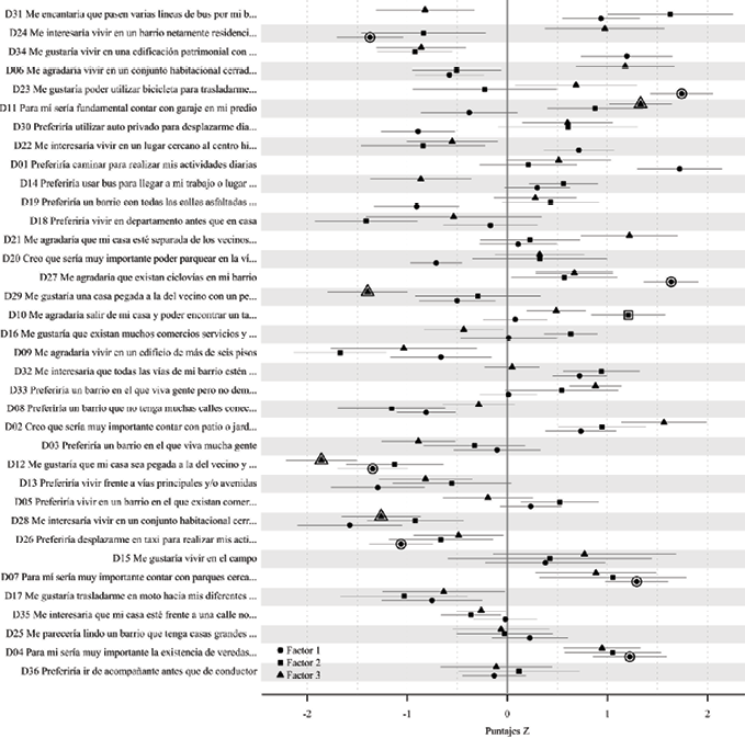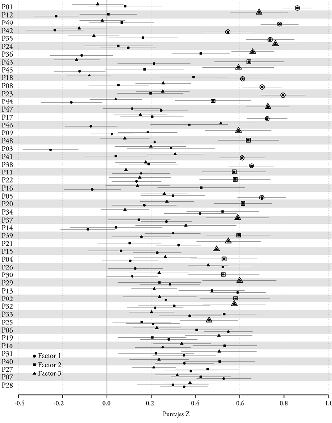 Nota: Los puntos representan el valor medio del puntaje Z de cada declaración para cada factor extraído. Las líneas representan los errores estándar. Los símbolos con doble contorno indican alto poder interpretativo