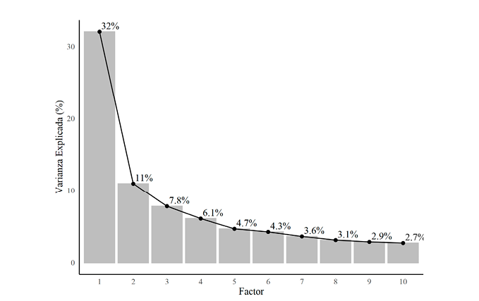 Los datos de las ordenaciones Q y del conjunto P se almacenaron en tablas .csv y se analizaron utilizando el software R (R Core Team, 2016) con el paquete qmethod (Zabala, 2014). Se realizó un gráfico de sedimentación y se determinó que, a partir del quinto factor, la varianza explicada no superaba el 5% (Figura 3) y solo tenía una ordenación cargada en él, por lo que solamente se analizaron las características de modelos con 2, 3 y 4 factores.