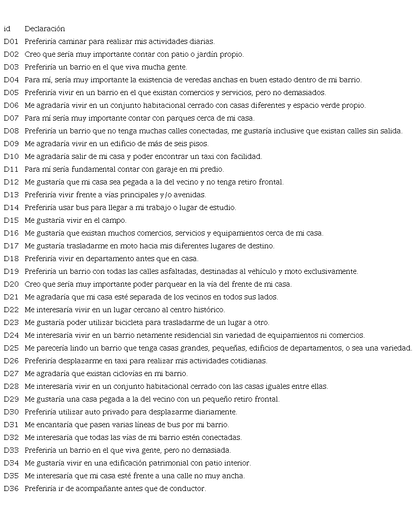 Para la presente investigación se creó un concurso con declaraciones referidas a sus dos componentes temáticos: i) las preferencias sobre el lugar de residencia según las características de los tejidos urbanos seleccionados; y ii) las preferencias relacionadas con los modos de desplazamiento. Las declaraciones iniciales fueron producto de la revisión de literatura y de ejercicios en proyectos anteriores. Ya que el estudio busca detectar preferencias y anhelos, las frases fueron escritas en tiempo condicional. Las frases fueron revisadas y agrupadas para formar un conjunto Q con 36 declaraciones (Tabla 1) y posteriormente validadas por investigadores externos al proyecto.