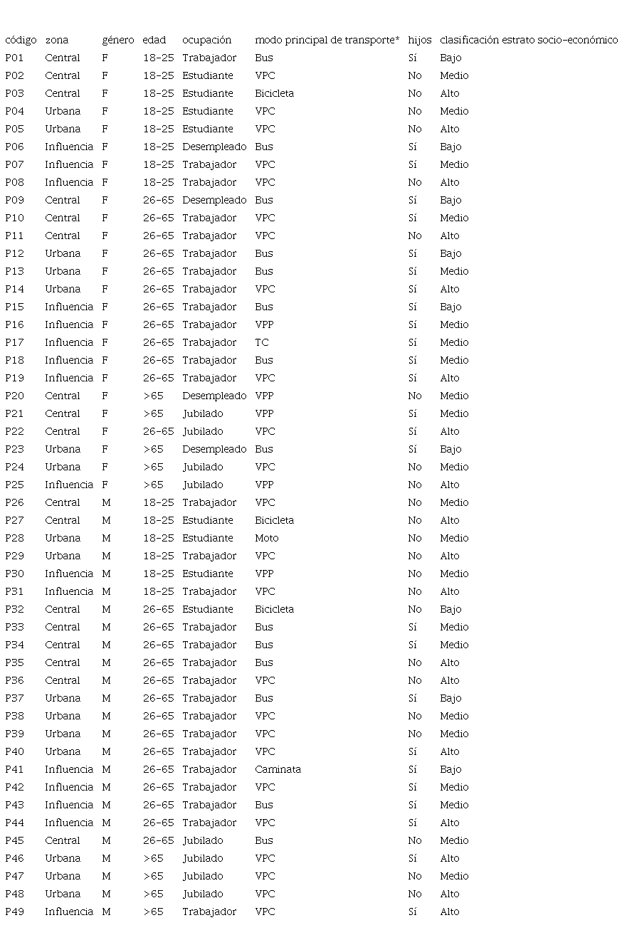 El conjunto P se generó mediante una estratificación basada en la edad, el género, el nivel socioeconómico y el lugar de residencia según la zonificación predefinida. Con estos criterios se identificó y contactó a los potenciales participantes utilizando una técnica de bola de nieve. Se logró concretar la participación de 49 personas distribuidas en las diferentes categorías (Tabla 2). El nivel socioeconómico fue inicialmente estimado por los investigadores y luego corroborado durante la aplicación del instrumento con un sistema de clasificación. La participación de personas de estratos socioeconómicos bajos y de adultos mayores fue un reto importante debido a la utilización de redes sociales electrónicas para el reclutamiento. Esto fue parcialmente mitigado gracias a la técnica de bola de nieve.