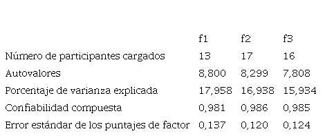 Luego de analizar las características de los modelos con 2, 3 y 4 factores, se seleccionó el modelo con 3 factores para el análisis, ya que representa un balance entre simplicidad y poder explicativo. En este modelo, 45 de los 49 participantes estuvieron cargados en al menos un factor, es decir, que los factores extraídos son útiles para representar los puntos de vista integrados de la gran mayoría de participantes. El método de bootstrapping identificó a 33 participantes que fueron marcados al menos un 75% de veces en alguno de los factores. En este modelo, todos los factores tuvieron autovalores mayores a 7,8, indicando que capturan una alta varianza; los valores de la confiabilidad compuesta fueron mayores a 0,98 y los errores estándar de los puntajes fueron menores a 0,14 (Tabla 3).