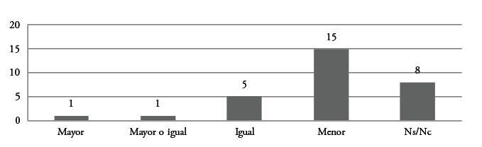 Finalmente, la frecuencia de recolección, referida a la cantidad de veces semanales en que se recogen los residuos, varía entre tres y seis días en barrios formales, según el distrito. Teniendo dicha frecuencia como referencia, en solo cinco distritos no se registrarían diferencias entre esos barrios y los barrios populares. Los restantes distritos se distribuyen del siguiente modo: en quince la frecuencia en barrios populares sería menor, en ocho no se obtuvo información concluyente, en uno sería mayor en barrios populares, y en el restante se afirmó que no sería menor, pero no se brindaron seguridades sobre si es mayor o igual que en barrios formales. Así lo muestra la Figura 5.
