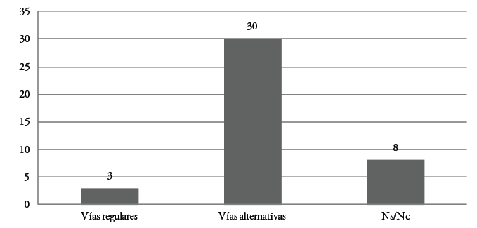 Los resultados obtenidos arrojaron que, en 30 distritos (73%), los servicios de rsu en barrios populares se llevarían a cabo por vías alternativas a las desarrolladas en barrios formales; en tres distritos (7%) no habría diferencias, y respecto de los ocho restantes (20%) no se dispuso de información certera. En estos últimos, los funcionarios entrevistados otorgaron información contradictoria, no quisieron contestar o señalaron no tener barrios populares en sus territorios. De aquí en adelante, este tipo de respuestas son categorizadas como Ns/Nc (Figura 1).