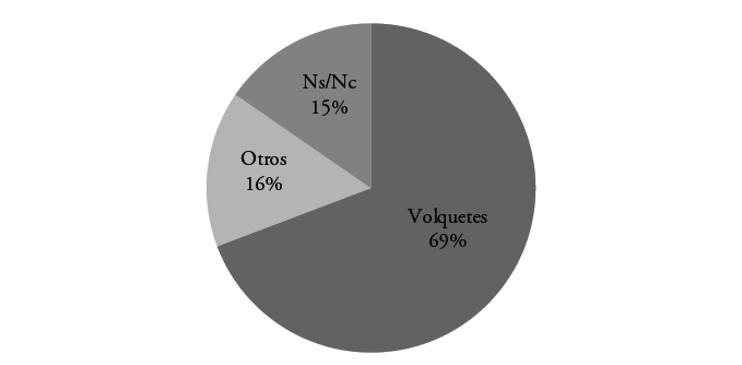 Respecto del equipamiento utilizado para la disposición transitoria de los rsu, se observan diferencias en 26 distritos. No obstante, la distribución es menos variada que la de los medios de recolección. Una categoría agrupa al 69% de los casos relevados: el uso de tolvas o volquetes en barrios populares, a diferencia de las campanas o contenedores comúnmente utilizados en barrios formales. Los volquetes son cajones abiertos, generalmente utilizados para residuos áridos o voluminosos y con una capacidad de carga que suele variar de 5 a 17 metros cúbicos. Los contenedores son dispositivos cerrados, con bocas laterales o superiores, específicamente elaborados para la disposición de rsu y con una capacidad de carga significativamente menor. Mientras que al uso de contenedores o campanas se lo ha denominado contenerización, denominamos al de volquetes como volqueterización. Por lo general, la volqueterización consiste en la disposición de un volquete por barrio popular en algún lugar que facilite el acceso de camiones volqueteros para ser retirados. En suma, la Figura 4 indica cómo, de los 26 distritos que emplean equipamientos alternativos en barrios populares, 18 apelan a la volqueterización.