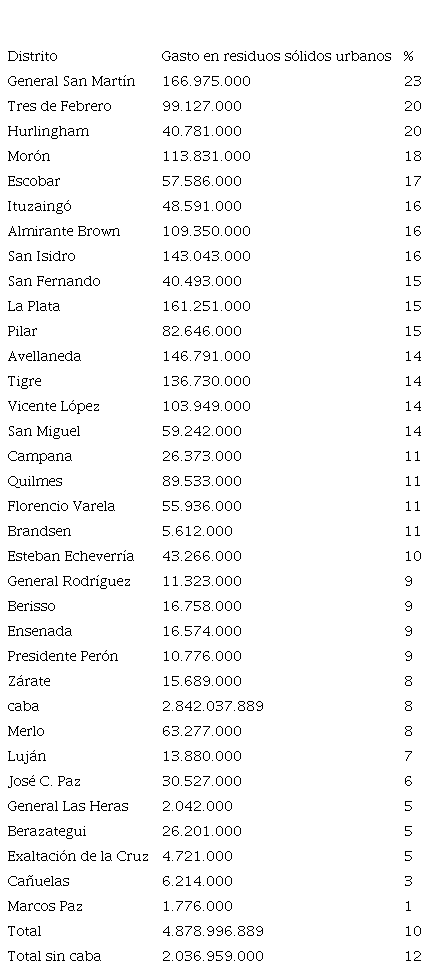 En todos los casos, ya sea que los resuelvan por sus propios medios o a través de empresas privadas, los servicios de rsu representan una erogación importante para los gobiernos locales. Sin embargo, la caba dispone para tales fines de recursos muy superiores a los de los partidos bonaerenses de la rmba, incluso cuando algunos de estos asignen para ello mayores porcentajes de sus presupuestos. La Tabla 1 muestra el gasto en rsu para el año 2012 en valores absolutos y porcentuales para 34 distritos, incluyendo la caba.