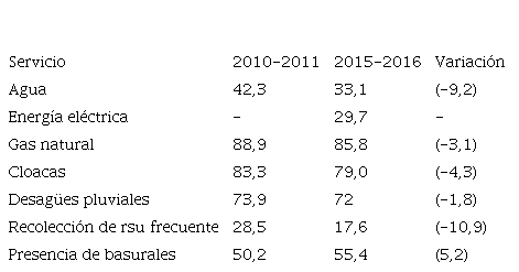 Dichos porcentajes, no obstante, se reducen significativamente cuando se analiza la situación de quienes residen en barrios populares, la cual ilustra el tercer rasgo referido más arriba: la pobreza de los barrios populares en materia de acceso formal a servicios. Al respecto, la Tabla 3 compara datos sobre ausencia o acceso irregular a servicios públicos en barrios populares de los partidos bonaerenses de la rmba en los periodos 2010-2011 y 2015-2016.