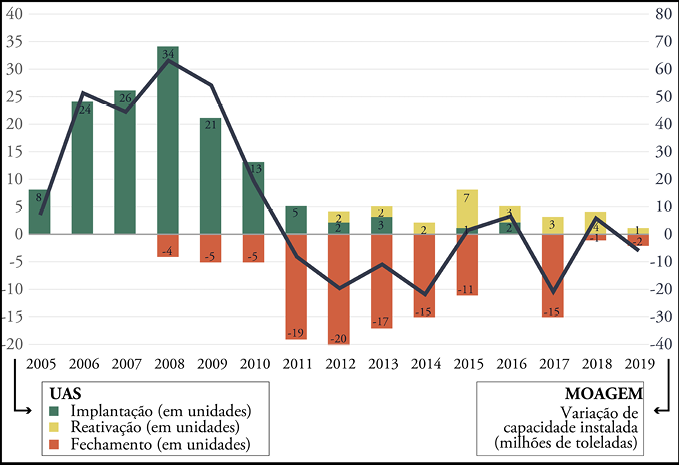 Para além do crescente volume de dívidas, a crise atual implica em arranjos que se manifestam, dentre outros modos, no fechamento de uass e na consequente diminuição da capacidade produtiva (Figura 1). No período de 2005 a 2019, vários grupos solicitaram recuperação judicial, iniciativa tomada por empresas em dificuldades financeiras sob respaldo da lei 11.101/2005 (Brasil, 2005), para negociar com seus credores, com a devida mediação da Justiça, prazos maiores e facilitados para saldar dívidas e evitar falência. Outros grupos, todavia, decretaram diretamente falência pela impossibilidade de se recuperarem. Com essas duas situações, foi comum o encerramento temporário e permanente de uass localizadas em muitas partes do país.