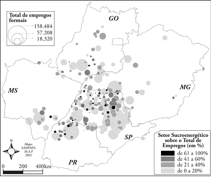 Esse indicador revela os municípios potencialmente mais afetados pela retração de renda decorrente de eventual fechamento de uass, podendo precipitar uma crise local grave o suficiente para justificar decretação de calamidade pública. Isso ocorre na medida em que o impacto da crise afeta tanto os empregos diretos quanto indiretos, pois reduz o mercado consumidor local. Dado seu potencial de afetar o município, esse indicador recebeu o maior peso: 3. O mapa da Figura 2 ilustra os municípios com maior dependência do emprego gerado pelo setor sucroenergético. Salientam-se, em tonalidade mais escura no mapa, diversos municípios de pequeno patamar demográfico, com notável concentração desse fenômeno no oeste do estado de São Paulo e no noroeste do Paraná.