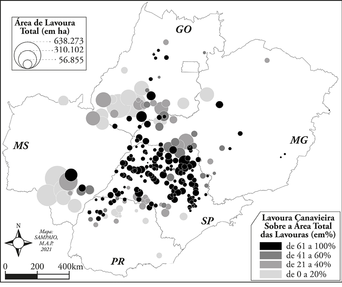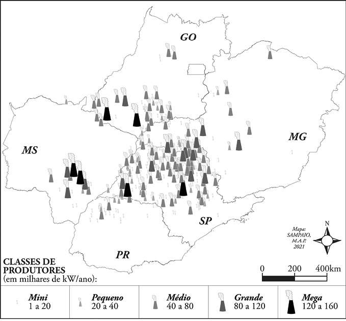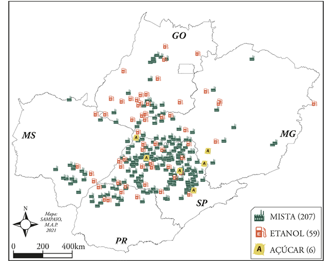 Durante o movimento de expansão e crise das duas primeiras décadas do século xxi, ocorreram significativas mudanças na dimensão territorial do setor sucroenergético. Resultado da instalação de novas uass (greenfields) e ampliação/modernização de outras existentes (brownfields), a produção de cana-de-açúcar duplicou-se entre 2000 e 2019 (de 4,8 milhões para pouco mais de 10 milhões de ha.) (Instituto Brasileiro de Geografia e Estatística [ibge], 2020). Foi sobretudo na bacia hidrográfica do Alto Paraná, notadamente (mas não exclusivamente) em áreas do bioma Cerrado, onde ocorreu 95% da expansão da produção no país. Novas uass mais modernas que as das gerações anteriores foram instaladas nos estados de São Paulo (ainda hoje o maior produtor), Paraná, Mato Grosso do Sul, Minas Gerais e Goiás (Castillo, 2015; Sampaio, 2015). Essa área conforma o que Castillo e Sampaio (2019) denominaram de Macrorregião Sucroenergética do Centro-Sul do Brasil.