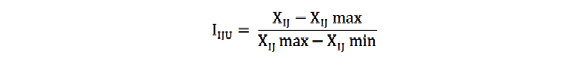 Para o agrupamento e elaboração do indicador-resumo, foi realizado o procedimento de transformar os valores em números numa escala de 0 a 1. O cálculo considerou que quanto mais próximo de 1 mais vulnerável é o município e, quanto mais próximo de 0, menos vulnerável. Esse procedimento foi realizado de duas formas, conforme os dados dos indicadores. Para os dados que apontam para uma grandeza relativa ao total do município, foi calculado o percentual.2 Já para os indicadores que apresentam uma grandeza absoluta (número de uass no município, Valor Adicionado Total, população total e cogeração de energia), foi adotada um procedimento para comparar o dado com o valor máximo e mínimo do universo de análise. Baseado em Santos (2011), os valores foram convertidos em números entre 0 e 1 a partir da seguinte fórmula: