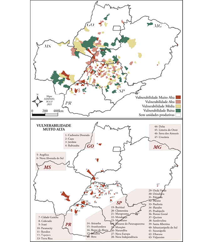 O estado de São Paulo, principal produtor do país, é também o que concentra maior número de casos de municípios com muito alta vulnerabilidade, apesar de tal condição também aparecer com maior intensidade nos estados do Paraná e Goiás e, em menor grau, em Minas Gerais e Mato Grosso do Sul. Em parte significativa da porção territorial avaliada, os casos de alta e muito alta vulnerabilidade se estendem às áreas recém-acionadas ou onde a produção foi muito intensificada durante a expansão recente do setor (início do século xxi). Ou seja, tais vulnerabilidades foram promovidas a partir de modernos investimentos, em parte oriundos de grupos transnacionais, que hoje controlam percentual significativo da produção do setor e adquirem, inclusive, boa parte dos financiamentos a juros baixos custeados pelo Estado brasileiro.