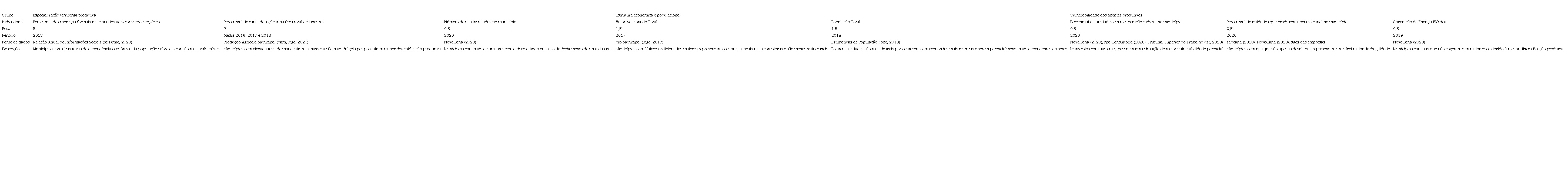Como forma de identificar quais municípios canavieiros se encontram em situação mais vulnerável economicamente, foi elaborado um Índice de Vulnerabilidade Territorial dos municípios canavieiros (ivt-Cana). Apesar da análise do artigo focar na vulnerabilidade econômica dos municípios, o termo “vulnerabilidade territorial” integra, além da econômica, outras dimensões locais (social e política) que acabam sendo afetadas pela crise associada ao fechamento da uass. Como resultado, elaboramos um indicador-resumo (Benelli, 2019; Santos, 2011) que fornece evidências sobre a situação dos municípios onde o fechamento de uma uas pode gerar impactos mais graves, ocasionando potencialmente o colapso da economia local. O índice foi calculado tendo por base oito indicadores, agregados em três grupos distintos: i) grau de especialização territorial produtiva; ii) estrutura econômica e populacional do município e iii) vulnerabilidade dos agentes produtivos (Tabela 1). Cada indicador recebeu um peso específico, variando entre 0,5 (baixo) e 3 (alto) segundo critérios qualitativos que são apresentados e justificados a seguir. Ao final, foi calculada a média ponderada.
