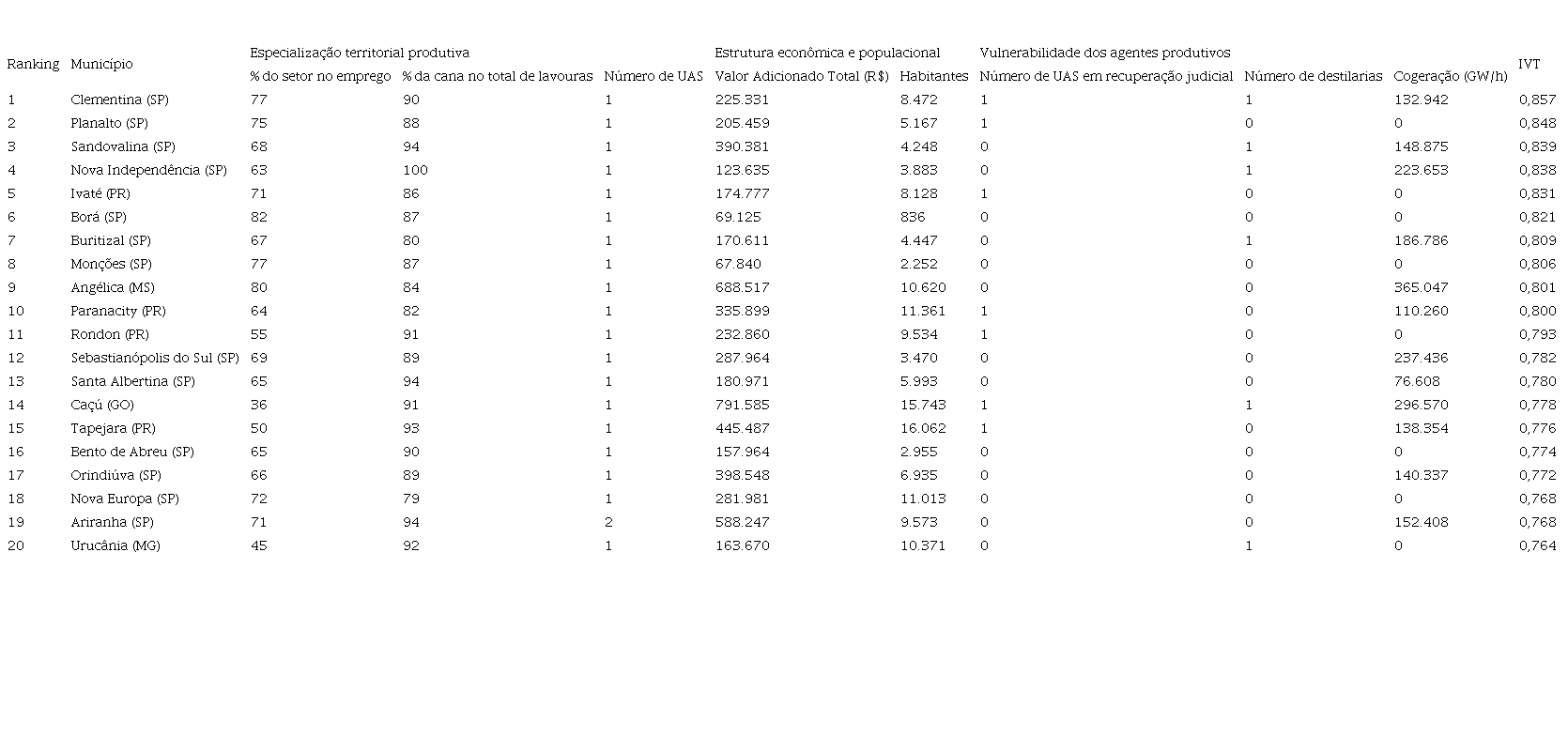 Tomando como princípio que o grau de vulnerabilidade territorial resulta do nível de especialização e dependência do município (no que concerne a geração de emprego, grau de ocupação dos cultivos e número de uass instaladas), de condições dos agentes produtivos (especificidades técnicas de produção e condição econômico-financeira dos grupos), bem como da estrutura econômica e populacional (mais ou menos robusta/diversificada), o exercício de elaboração do ivt-Cana nos permitiu reconhecer quais são os municípios mais vulneráveis à graves consequências econômicas provocadas por eventuais situações de recuperação judicial, falência e fechamento de uass no atual contexto de crise do setor. Tal cenário revela como a inversão de grandes investimentos e seu poder de transformação econômica e territorial em municípios de pequeno porte pode também se tornar uma armadilha à sociedade e ao poder público local. Quando faltam os mecanismos de regulação por parte do Estado, o resultado quase sempre é a produção de extrema especialização e dependência, como pode ser observado em toda a macrorregião produtiva sucroenergética do Centro-Sul do Brasil.