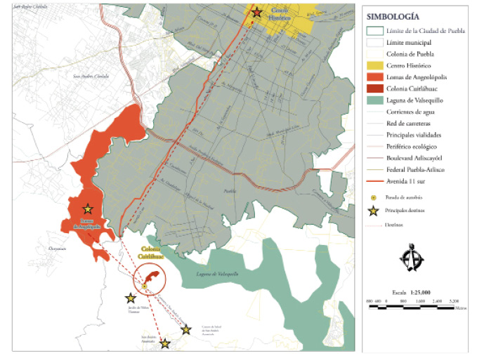 Sus principales destinos se sitúan en un radio de 6 km, donde se encuentran un centro de salud, la cabecera municipal de San Andrés Azumiatla (aquí acuden por cuestiones de salud, abasto, escuela, y a los días de plaza), la zona residencial Lomas de Angelópolis y un jardín de niños. El centro histórico es un destino al que concurren para trabajar, abastecerse y asistir a la escuela, pocas veces para fines recreativos (Figura 3). De todos ellos, el principal punto de destino es la zona residencial Lomas de Angelópolis, ubicada a unos 6 km, donde los hombres trabajan en la industria de la construcción (albañilería, plomería, acabados, etcétera) y las mujeres, como empleadas domésticas. Su tiempo regular de traslado es de aproximadamente una hora, ya que deben transbordar, y a veces se puede prolongar hasta hora y media debido a las largas esperas para tomar el autobús.