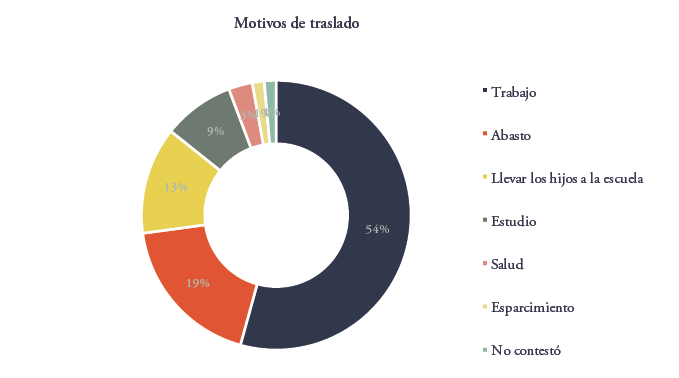 De acuerdo con nuestras encuestas, observamos que los rubros trabajo (54%) y abasto (19%) son los principales motivos de traslado. El 13% representa a las amas de casa que llevan a sus hijos menores de edad a la escuela; particularmente en este rubro, las amas de casa nos explicaron que los tiempos de traslado les quitan demasiado tiempo para hacer otras actividades. El 9% representa a los estudiantes de nivel medio superior, ocupado por mujeres que estudian y trabajan (Figura 4).