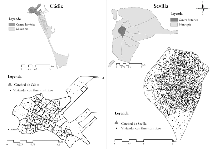 El estudio se centra en las ciudades de Sevilla y Cádiz, pudiéndose extrapolar también a ciudades latinoamericanas que tienen características parecidas, al compartir idioma, cultura e historia, salvando las distancias sobre todo respecto del tamaño poblacional de las ciudades americanas respecto a las españolas. Sevilla y Cádiz constituyen dos casos de fuerte interés, dado que ambas son ciudades turísticas con centros históricos de grandes dimensiones y con una reconocida historia y evolución en las últimas décadas (Mato, 2005; Villar & Fernández, 2017), y se han convertido en un importante recurso económico para la economía local.