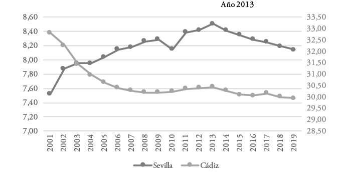 El peso de la población del centro histórico en el municipio de Sevilla venía incrementándose desde principios del siglo xxi de forma notable. Esta tendencia se frena y se invierte desde el año 2013, desde el cual se han perdido aproximadamente 3.000 residentes, lo que elimina gran parte del crecimiento anterior. En Cádiz, el peso de la población del centro histórico sobre el total del municipio venía descendiendo a un elevado ritmo hasta 2006, cuando la tendencia se frena, produciéndose incluso un leve incremento del peso entre 2010 y 2013, pero de nuevo a partir de esta fecha el centro histórico vuelve a perder peso (Figura 2).