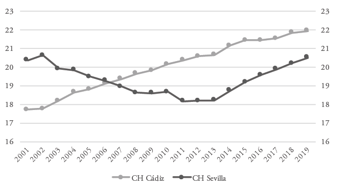Respecto a la evolución del envejecimiento poblacional, los datos apuntan a que ambos centros históricos se encuentran muy envejecidos. En el caso de Sevilla, un 20% de la población de su centro histórico es mayor de 65 años, una proporción que apenas varía entre 2001 y 2019. En Cádiz la proporción de adultos mayores superaba el 17% en 2001, aumentando más de cuatro puntos en 2019, para acercarse al 22%. La Figura 3 muestra esta evolución año a año. Aunque aparentemente la proporción de personas mayores no ha variado mucho en el centro histórico de Sevilla, observando el gráfico vemos cómo dicha cifra se redujo en varios puntos porcentuales entre 2001 y 2012, al mismo tiempo que este sector ganaba población total y peso demográfico en el conjunto de la ciudad. En Cádiz, por el contrario, el incremento del envejecimiento ha sido constante desde 2002 (Figura 3).