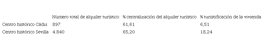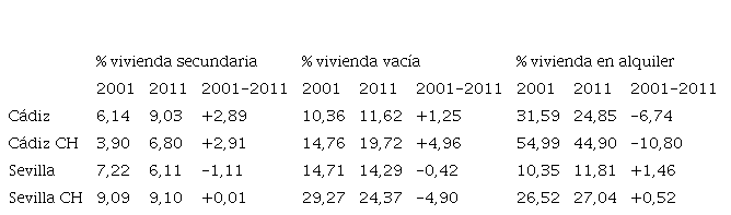 Ya en 2011, en la ciudad de Sevilla los datos reflejan una mínima disminución de la proporción de vivienda secundaria, mientras el centro histórico se mantiene estancado, al contrario que en Cádiz, donde la vivienda secundaria aumenta en la ciudad y su centro histórico casi en tres puntos. La vivienda vacía disminuye en Sevilla, siendo llamativa la cifra de cerca de cinco puntos porcentuales que pierde el centro histórico. En Cádiz este dato no varía de manera excesiva en el municipio, pero sí en su centro histórico, aumentando casi en cinco puntos, hasta acercarse a un 20% del stock de vivienda vacía. Como resultado, el centro histórico de Cádiz cuenta con un mayor porcentaje de viviendas no habitadas de manera continuada, un 26%, mientras que en el centro histórico de Sevilla este dato baja hasta el 23%. En cualquier caso, estos datos demuestran que, en el siglo xxi, en ambos centros históricos existe una infrautilización del parque de viviendas que podían ser utilizadas para el alquiler turístico.