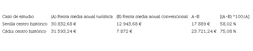 En la Tabla 3 se muestra el diferencial de renta turística, calculada como se indicaba en detalle en el apartado metodológico. El indicador muestra la diferencia de renta que obtendría un arrendador entre un alquiler convencional y uno turístico, para un apartamento de dos habitaciones en el centro histórico, calculado para un año completo. En el centro de la capital andaluza, el incremento del beneficio bruto arrojado por un departamento de este tipo sería de un 58,02%, mientras que en el centro histórico de Cádiz sería aún mayor, llegando al 75,08%. Esta diferencia sería la principal motivación para cambiar alquileres convencionales por alquileres turísticos, o para introducir viviendas vacías en este tipo de mercado. La gran diferencia entre Sevilla y Cádiz puede deberse a la mayor restricción de la oferta en la segunda ciudad, menor número de alquileres turísticos que coincide con un parque de viviendas más intensamente utilizado en el centro histórico, menor peso de las viviendas vacías y mayor peso del alquiler convencional.