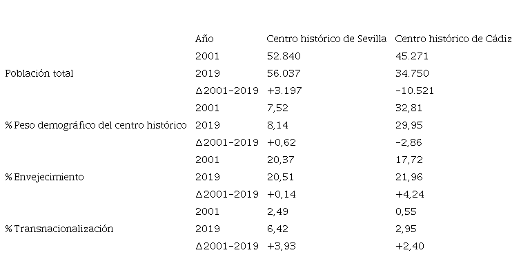 En el año 2019, la población que vivía en el centro histórico de Sevilla alcanzaba un total de 56.037 habitantes, lo que supone un incremento de más de 3.100 personas con respecto al año 2001; en Cádiz ocurre lo contrario: en el mismo periodo pierde más de 10.000 habitantes, quedándose el centro con 34.750 residentes. Podemos observar cómo el centro histórico de Cádiz tiene más peso poblacional que la ciudad de Sevilla, a pesar de haber perdido habitantes y Sevilla de haberlos ganado. Un 29,95% de la población total de Cádiz sigue viviendo en el centro, mientras que en Sevilla este dato es tan solo un 8,14% (ver Tabla 4).