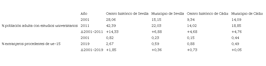 Los datos de la Tabla 5 añaden un matiz a las observaciones anteriores sobre el cambio poblacional en los dos centros históricos objeto de estudio. La población que ha promovido el crecimiento y rejuvenecimiento durante ciertos periodos ha sido de estatus relativamente alto, lo que indica cierto grado de gentrificación e incluso cierto grado de gentrificación transnacional. El centro histórico de Sevilla aumenta más del doble su población con estudios universitarios en comparación con el total del municipio, alcanzando un 42,39% de personas con dicho rango. En Cádiz no ocurre lo mismo y el municipio en su conjunto tiene mayor peso de personas con estudios superiores que el casco antiguo; el crecimiento ha sido muy parejo tanto en la ciudad como en el centro histórico, pero los datos reflejan que el centro histórico de Cádiz no es y no parece tender a ser un espacio privilegiado de la ciudad, muy al contrario que en el caso de Sevilla. En comparación con los valores nacionales y regionales, los municipios de Sevilla y Cádiz presentan valores superiores a los de referencia. Así, en España, en 2001 el 13,20% de la población tenía estudios superiores, siendo en Andalucía este dato de un 11,10%. En 2011 el dato nacional aumentó hasta el 17,90% y el andaluz alcanzó el 14,60% de la población con estudios superiores.