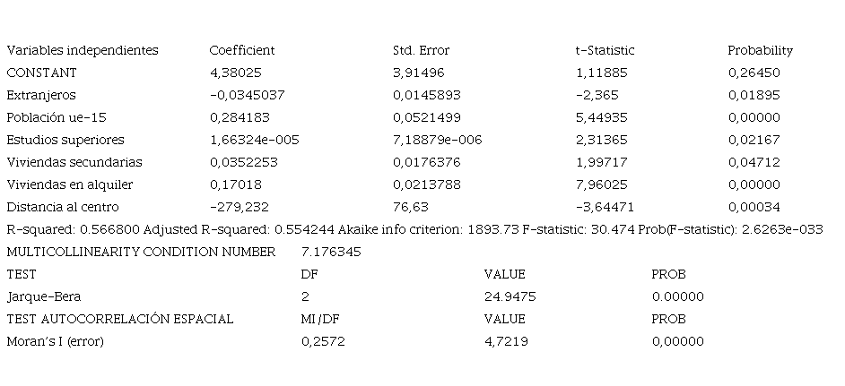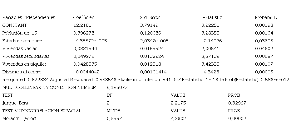 Finalmente, se ha realizado una regresión clásica de mínimos cuadrados (ols), tomando como variable dependiente el número de alquileres turísticos ofertados por Airbnb a escala de sección censal. El resultado explicaría un porcentaje de la varianza de esta variable dependiente a partir de la distribución de otra serie de variables independientes, descartando estadísticamente la probabilidad de ausencia de relación entre ellas. El programa utilizado es Geoda, que añade a los test que suelen realizarse en este tipo de modelos, test de autocorrelación espacial (en concreto aquí se ha utilizado la I de Morán), basado en una matriz de pesos espaciales creada a partir de la cartografía censal. Este test sirve básicamente para descartar la existencia de una distribución aleatoria de las variables (Rey et al., 2015).