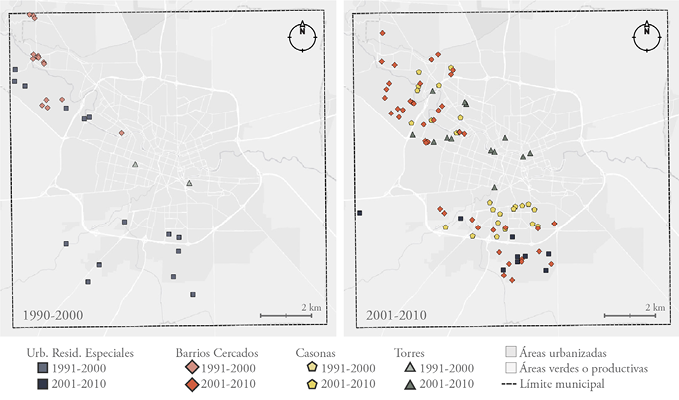 La Figura 2 también permite comparar la localización de las tipologías. Los Barrios Cercados, por ejemplo, ocupan sectores similares a los de las ure, pero más extensos en todas las direcciones. Sin embargo, durante el primer periodo, en la zona sur solo hubo ure; el resto de las tipologías aparece en esta zona recién durante el segundo periodo.