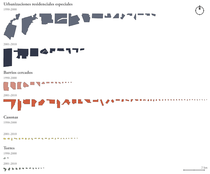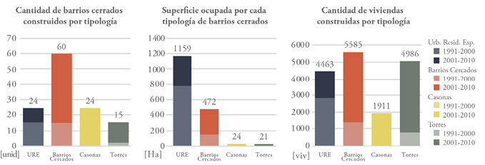Lo anterior indica que, del total de superficie destinada a la modalidad de barrios cerrados (1.677,5 ha), las ure ocuparon el 69,15%, los Barrios Cercados el 28,14%, las Casonas el 1,43% y las Torres el 1,28%.