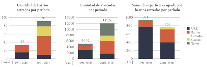 Los datos anteriores se ven contrastados por el decrecimiento de la suma de superficie ocupada por barrios cerrados entre el primer y segundo periodo. La explicación de este suceso subyace en que, si bien durante el segundo periodo se construyen aproximadamente tres veces más barrios cerrados que durante el primero, las formas de agrupación de las viviendas de las tipologías del segundo periodo reflejan una menor demanda de superficie por parte de los nuevos habitantes. Este cambio se ve propiciado por la menor cantidad de ure construidas y la disminución en su tamaño promedio.