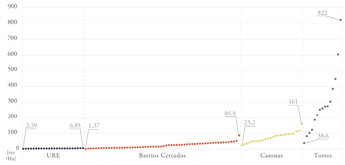 El estudio comparativo de las densidades de los diferentes casos permite inducir que, si bien cada tipología se maneja dentro de diferentes rangos de valores, estos valores se solapan con los de otras tipologías. De lo anterior se entiende que ciertos valores de densidad pueden ofrecer diferentes tipologías residenciales e incluso diferentes modalidades de organización de las viviendas (unifamiliares o multifamiliares). Por ejemplo, si desde la planificación se estuviese buscando garantizar 50 viv/ha, las mismas se pueden lograr tanto con un Barrio Cercado como con una Casona. En última instancia, lo anterior viene a demostrar que la adopción de ciertas tipologías no garantiza por sí misma una densidad habitacional específica, sino que otros factores proyectuales (altura de la edificación, factor de ocupación del suelo, factor de ocupación total, retiros linderos, etcétera) también estarán involucrados.