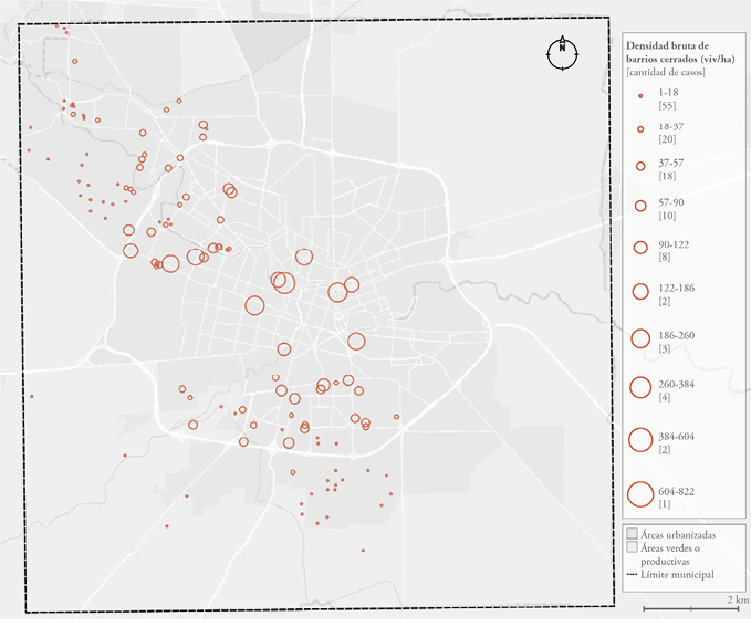 La georreferenciación de estos datos permite distinguir diferentes áreas donde los barrios cerrados construidos presentan dimensiones similares en términos de cantidad de viviendas. Las más distinguidas son: un área que los desarrolladores denominaron Valle Escondido, compuesta por varios Barrios Cercados (sobre el corredor noroeste de la ciudad, entre la Reserva Militar y el río Suquía); al noroeste de esta área se encuentran tres de las seis ure de mayor cantidad de viviendas de la ciudad (Las Delicias, Lomas de la Carolina y El Bosque); en ese mismo corredor, marcado por la Av. Colón, pero por dentro del anillo de la Av. Circunvalación, hay también una sucesión de Torres de gran cantidad de viviendas. Los sectores donde se asientan las intervenciones de menor escala son más dispersos; el único que es posible identificar se ubica también en el corredor noroeste, próximo a la Av. Recta Martinoli. Nuevamente, esto se explica por la versatilidad que dichos lotes tienen para encajar en diferentes sectores de la ciudad.