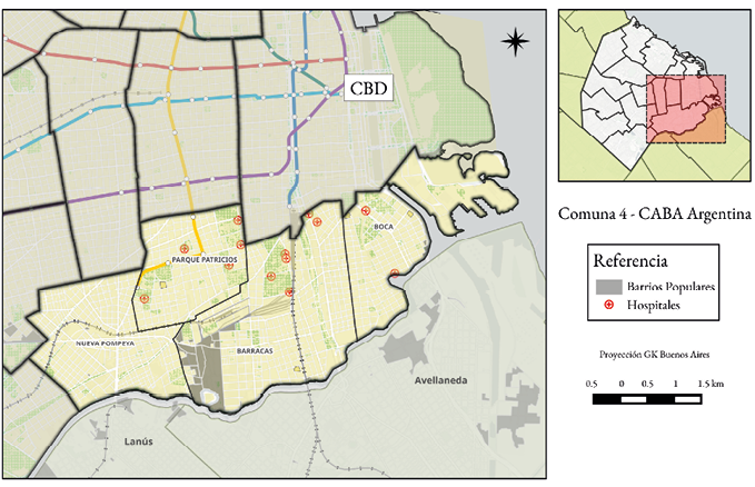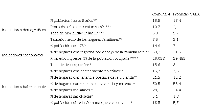 En la última década, en el marco del último plan general de “revitalización del sur”, la Comuna 4 de la Ciudad de Autónoma de Buenos Aires (CABA) (Figura 1) ha sido afectada por políticas de renovación urbana, desarrolladas a partir de la caracterización de dicha zona como un área históricamente deteriorada y/o subutilizada, con un pasado industrial desarticulado desde la reestructuración de los años setenta, escasa presencia del Estado, concentración de población de muy bajos ingresos, con una tradición de organización comunitaria de cierta envergadura. Entre dichas políticas destaca la creación de diferentes Distritos Económicos Especializados, acompañada de importantes inversiones en infraestructura y equipamiento públicos orientadas a modificar la calidad urbana en materia de seguridad, transporte, espacios públicos y verdes, entre otras facilidades.