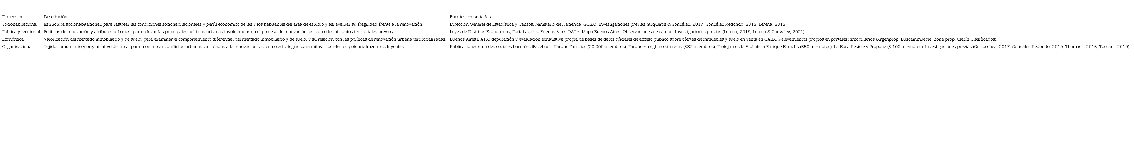De acuerdo con la propuesta analítica presentada, un examen de los efectos socioterritoriales de la renovación urbana debería considerar cuatro dimensiones de análisis: i) estructura sociohabitacional, para rastrear las condiciones sociohabitacionales y perfil demográfico de las y los habitantes del área de estudio, y así evaluar su fragilidad frente a la renovación;2 ii) dimensión política y territorial, para relevar las principales políticas urbanas involucradas en el proceso de renovación, así como los atributos territoriales previos; iii) dimensión económica: identificar el comportamiento diferencial del mercado inmobiliario y de suelo, los cambios en los usos del suelo, nuevos desarrollos y su relación con las políticas de renovación urbana, para evaluar las condiciones materiales de acceso a la vivienda en la zona; iv) dimensión organizativa: identificar el tejido comunitario y organizativo del área y monitorear la existencia de conflictos urbanos vinculados a la renovación, así como estrategias desplegadas capaces de mitigar sus efectos excluyentes.