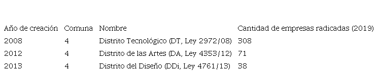Como fue mencionado, los Distritos Económicos son áreas delimitadas de la Ciudad, en las que se busca, mediante incentivos económicos e inversión pública en infraestructura urbana, la radicación de empresas especializadas en distintos rubros, como una nueva estrategia de valorización y desarrollo territorial para el sur de la Ciudad. Así, desde el año 2008 se crearon en la Comuna 4 el Distrito Tecnológico (Ley 2972/08), el Distrito de las Artes (Ley 4353/12) y el Distrito del Diseño (Ley 4761/13).