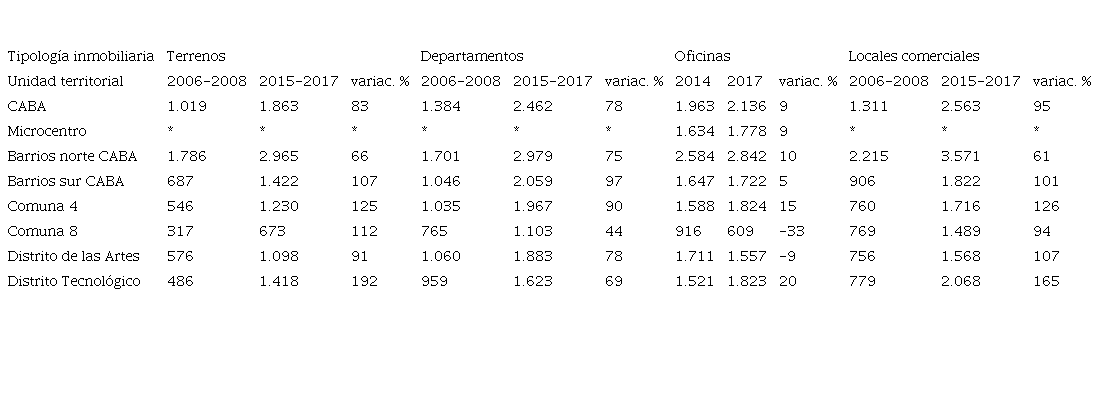 Para evaluar la valorización inmobiliaria y del suelo a partir de las políticas de renovación urbana en el sur de la Ciudad, se comparó la variación porcentual y el precio promedio absoluto por metro cuadrado de cuatro tipologías inmobiliarias: departamentos, terrenos, oficinas y locales comerciales en venta, en diferentes unidades territoriales de la Ciudad, en dos periodos: previo a la sanción de la ley del primer Distrito (el Tecnológico), y luego de pasada una década de su implementación (periodos 2006-2008 y 2015-2017). Al tratarse de un área tan vasta y heterogénea, se realizó un análisis multiescalar y comparativo, considerando el comportamiento diferencial de distintas unidades territoriales: a) el “sur ampliado” de la CABA, que incluye algunos barrios usualmente considerados del sur, pero con indicadores socioeconómicos e inmobiliarios más elevados; b) las Comunas 4 y 8; y c) los Distritos Tecnológico y de las Artes, dentro de la Comuna 4.