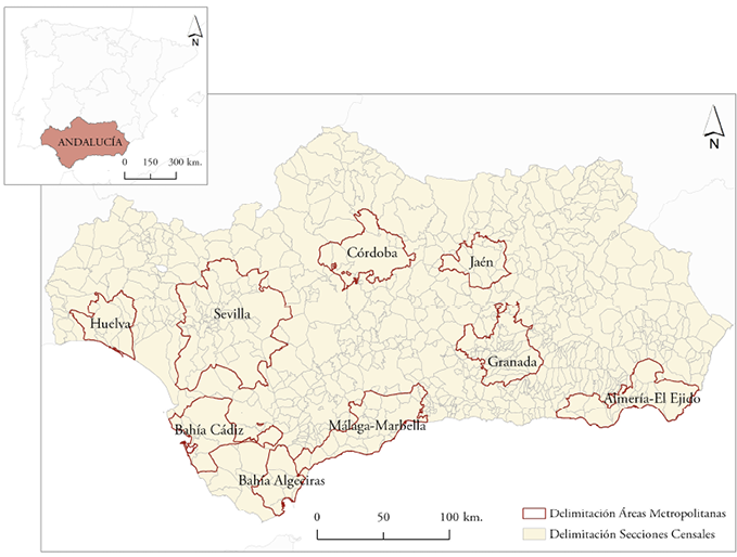 En este estudio se ha usado como escala de análisis, en primer lugar, el ámbito metropolitano de Andalucía. El área metropolitana es una escala ilustrativa de un marco de vida donde actualmente se producen las principales dinámicas económicas, sociales y demográficas (Feria & Martínez-Bernabéu, 2016; Feria et al., 2018). Dentro de la escala metropolitana se han explorado los datos a partir de una segunda escala, la sección censal, la cual representa la unidad espacial mínima de agregación de la información demográfica en España. Su tamaño medio, según datos del padrón de 2018, es de 1.409 habitantes, por lo que se puede considerar que corresponde a zonas socialmente homogéneas. Al respecto, Andalucía cuenta con 5.944 secciones censales, de las cuales 3.899 son de ámbito metropolitano (66%), y en 2019 agrupaban aproximadamente el 68% de la población andaluza (Figura 1).