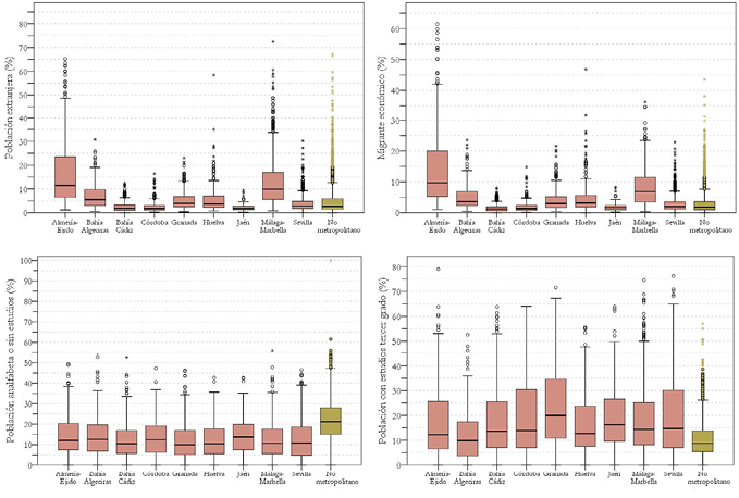Más contrastada resulta la distribución de la población con estudios de tercer grado, considerando que la mitad de las secciones censales del área metropolitana de Granada, Sevilla y Córdoba alberga una importante población con estudios de ese nivel. Mientras tanto, el resto de las áreas metropolitanas presenta una tendencia semejante, con una extensión intercuartil más limitada, entre 7% y 25%, y una media por debajo de la media metropolitana andaluza, del 19%.