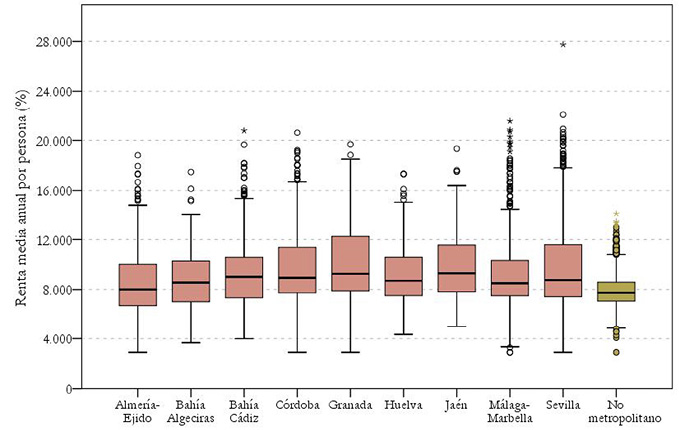 Finalmente el segundo criterio seleccionado a la hora de analizar el contexto del voto a VOX en las áreas metropolitanas de Andalucía es el nivel de renta. En este caso, los datos sobre la distribución de renta media en los hogares provienen del Atlas de Distribución de Renta del Instituto Nacional de Estadística (INE, 2017). Destaca al respecto, en primer lugar, una profunda divergencia entre las secciones censales metropolitanas y las no metropolitanas (Figura 3). Su estudio detallado pone de relieve una polarización en la renta de los ámbitos metropolitanos estudiados, que se pueden relacionar con la existencia de un importante grado de vulnerabilidad territorial. Esto es especialmente acusado en las áreas metropolitanas de Málaga-Marbella, donde aparecen zonas con niveles de renta inferiores a 3.000 euros, que contrastan con otros ámbitos con niveles superiores a 15.000 euros; y Sevilla, donde aparecen ámbitos con niveles de renta media cercanos a los 28.000 euros. Junto a estos casos extremos, destacan aquellos de las áreas metropolitanas de Granada y Jaén, que presentan las rentas medias más elevadas de todos los ámbitos. Esto contrasta con el caso del área metropolitana de Almería-El Ejido, que, con una renta media por habitantes de 8.597 euros, representa un valor muy por debajo de la media metropolitana andaluza y de la media andaluza en general. Todo ello se refleja en la distribución de las secciones censales en cada zona, en particular en la organización de las cajas intercuartiles (Figura 3). En su lectura se observa que si bien los límites divergen, su amplitud es parecida en el conjunto del territorio metropolitano andaluz, siendo ligeramente más reducida en el caso de Bahía de Algeciras. Ello pone de relieve una mayor homogeneidad en la distribución general de la serie, la cual es más amplia en el caso de Sevilla y Córdoba, apuntando de forma general a una mayor amplitud de nivel de renta en la mayoría de las secciones censales.