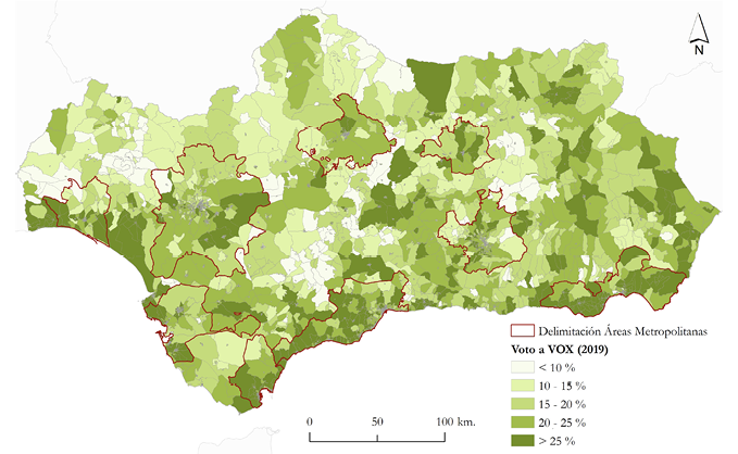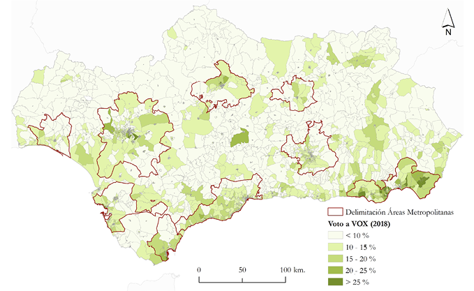 La aparición de VOX en las elecciones andaluzas de 2018, con el 10,97% de los votos (395.978 votos) y doce escaños y su posterior crecimiento y aparición a nivel nacional en 2019, supone una novedad en la realidad política española y andaluza que merece ser analizada. Recientemente se han realizado algunos acercamientos a esta irrupción de la extrema derecha en España y Andalucía a partir de dos vías: un enfoque individual mediante el uso de una muestra estadística reducida, orientación a partir de la cual no se suelen analizar en detalle los factores contextuales de los entrevistados (e.g. Rinken, 2019; Turnbull-Dugarte, 2019); o enfoques contextuales a nivel de toda Andalucía (Iglesias-Pascual et al., 2021). Considerando esta última orientación, sin embargo, tenemos que la importante diversidad regional de los resultados de VOX en Andalucía hace necesario analizar la distribución de las variables contextuales que explican el voto a VOX específicamente en los espacios metropolitanos andaluces, vale decir, aquellos territorios en los que el dinamismo socioeconómico y la concentración de la población migrante son más elevados (Iglesias-Pascual et al., 2021).