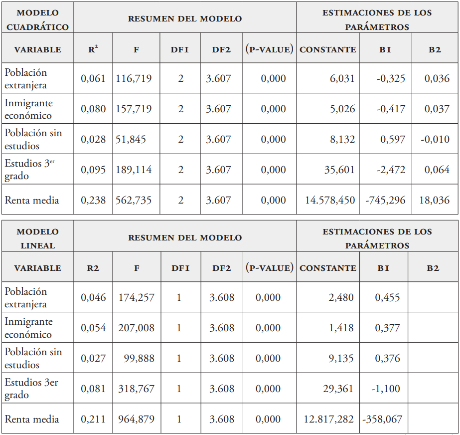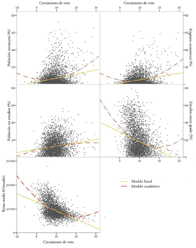 Es por lo anterior que, para profundizar en mayor medida en la incidencia que puedan tener los distintos factores socioeconómicos sobre el incremento de voto a VOX, se incluye en una segunda aproximación un análisis de regresión, que nos muestra las posibles relaciones de dependencia del conjunto de variables sobre este incremento para todo el espacio metropolitano andaluz, más allá de las distintas relaciones de interdependencia observadas gracias al análisis de correlación. Esta segunda aproximación nos permite, además, probar modelos de ajuste tanto lineales como no lineales, o cuadráticos, entendiendo que son muchas las ocasiones en las que, para entender la relación entre variables de tipo socioeconómico, resulta conveniente la aplicación de estas aproximaciones no lineales, por mostrar un mejor grado de ajuste.