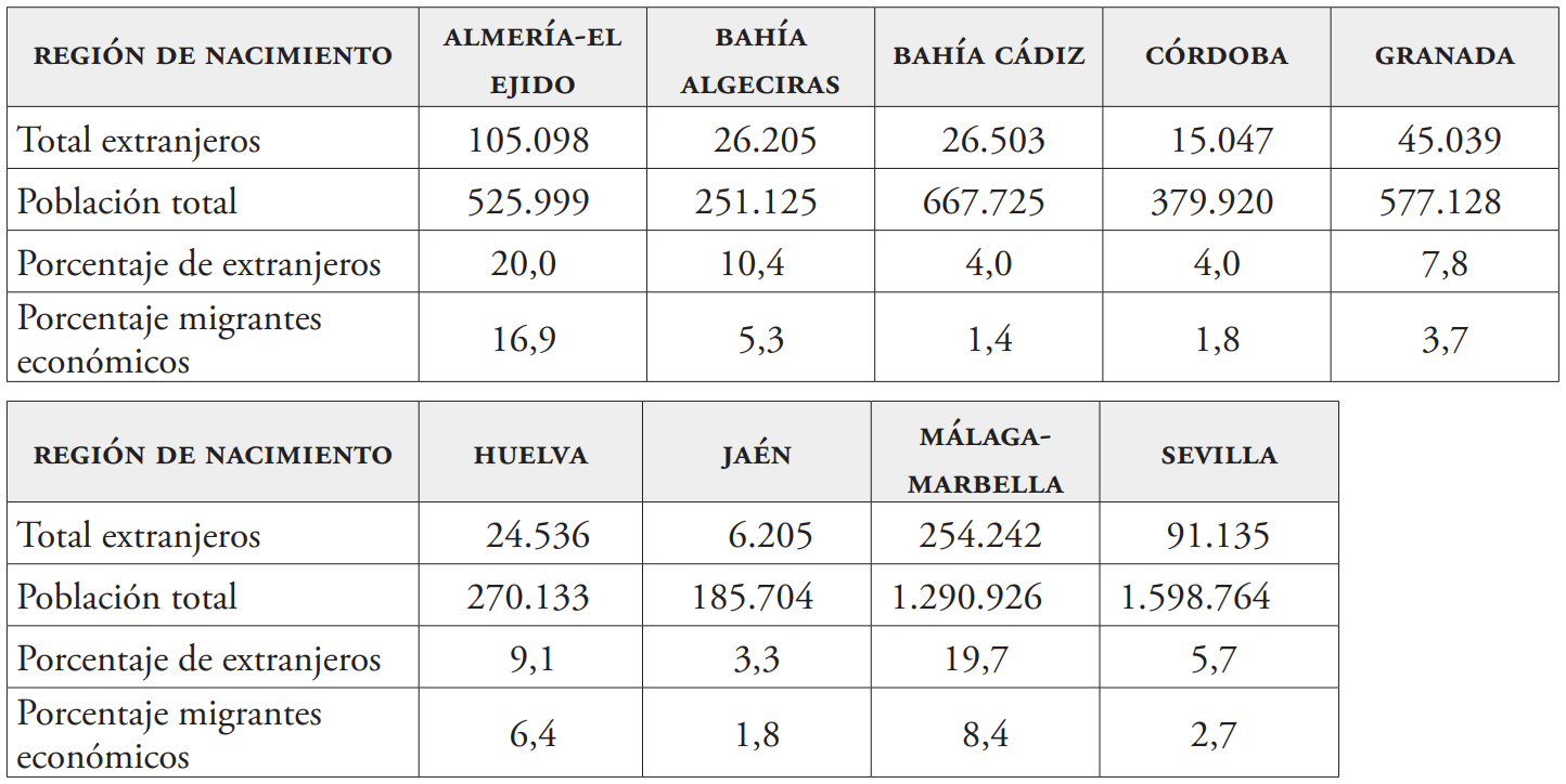 Estos últimos aspectos, junto la emergencia por primera vez de la extrema derecha en Andalucía y, por ende, en España tras la caída de la dictadura, justifican la elección del ámbito de estudio y su escala de aproximación. No obstante, se debe partir de la consideración de que el espacio metropolitano supone apenas un 24% del territorio andaluz, en el cual se asienta una población con una estructura demográfica muy heterogénea y un modo de vida diferenciado al del resto de la región de carácter rural (Tabla 1). Muestra de este carácter heterogéneo, las áreas metropolitanas de Sevilla, Málaga-Marbella y Granada representan, entre las tres, el 50% del territorio metropolitano andaluz. Si bien las dos primeras son también las más pobladas, Bahía de Cádiz sería la tercera demográficamente hablando, y entre las tres dan cuenta del 63% de la población metropolitana andaluza. Paralelamente, es de destacar que Málaga-Marbella y Almería-El Ejido albergan el 60% de la población extranjera residente en espacios metropolitanos en Andalucía. Con perfiles muy distintos, estos dos espacios representan las grandes tendencias migratorias en Andalucía. Así, mientras el área metropolitana de Málaga-Marbella acoge una importante comunidad extranjera cuya actividad se centra principalmente en el sector turístico y de servicios, es a la vez un espacio atractivo para los jubilados con alto nivel de recursos (Rodríguez, 2004). Sin embargo, en el caso de las áreas metropolitanas de Almería, Huelva y, en menor medida, Granada, la presencia de población extranjera se debe principalmente al importante peso de la agricultura en la economía productiva, en particular de los cultivos intensivos de invernaderos, áreas donde predominan de forma muy destacada los migrantes económicos (Gualda et al., 2015).