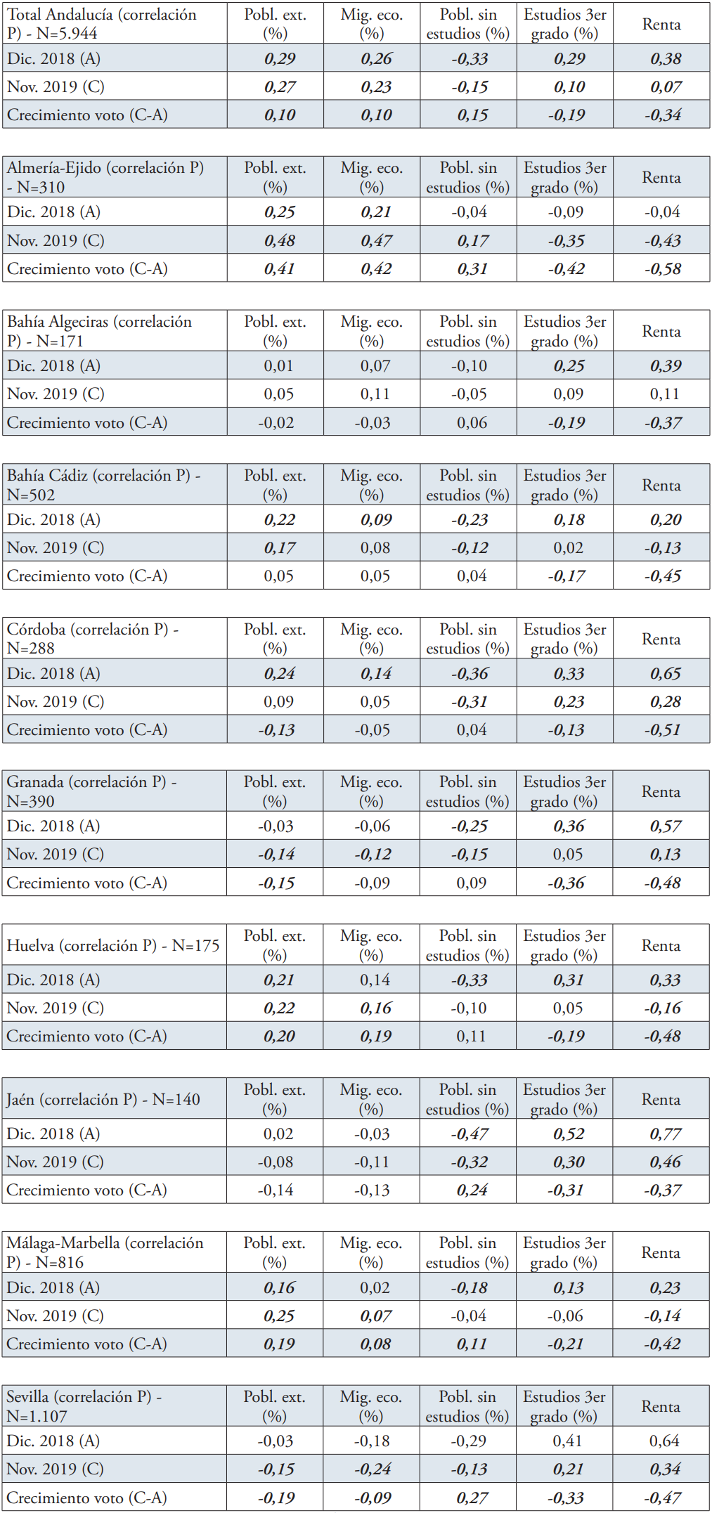 En cuanto a las variables socioeconómicas, resulta clara la falta de relación entre el voto a VOX y la población sin estudios en ambos años (excepto Almería, 2019). Respecto al nivel de renta, en todas las áreas (excepto Almería) se encuentra una relación positiva respecto del voto a VOX y el mayor nivel de renta. Dicha relación siempre es más importante en 2018 que en 2019. La misma relación, incluida la excepción de Almería, se observa entre el mayor nivel de estudios y el voto a VOX.