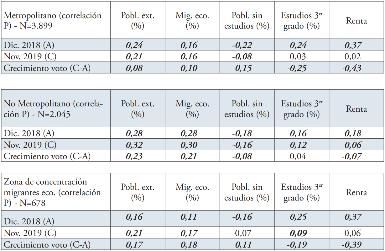 Así, se puede considerar que este estudio significa una aportación relevante y novedosa desde distintas perspectivas: i) el ámbito de estudio seleccionado, ya que el ascenso electoral de la extrema derecha en España y el sur de Europa es un fenómeno que hasta ahora ha sido poco estudiado (e.g. Rinken, 2019; Simón, 2020; Turnbull-Dugarte, 2019); ii) el enfoque propuesto permite, por primera vez en España, hacer una análisis detallado de las características socioterritoriales del incremento del apoyo electoral a la extrema derecha en el ámbito metropolitano; de este modo, se aborda un aspecto que también ha sido escasamente analizado por la literatura académica internacional; iii) el enfoque aplicado permite, a su vez, enriquecer el debate académico tanto sobre el papel de las teorías del conflicto (Blalock, 1967; Blumer, 1958) y el contacto (Allport, 1954) en el voto a la extrema derecha, como sobre la importancia del espacio compartido en el proceso de integración de la población migrante en la sociedad de acogida (Iglesias-Pascual et al., 2019; Iglesias-Pascual et al., 2021).